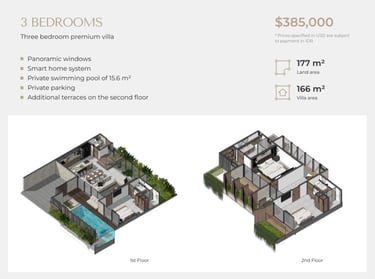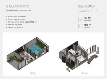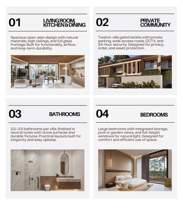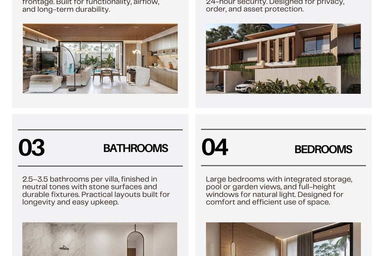 Each villa has been carefully designed to optimize space, natural light, and privacy while maintaining a harmonious flow between indoor and outdoor areas.